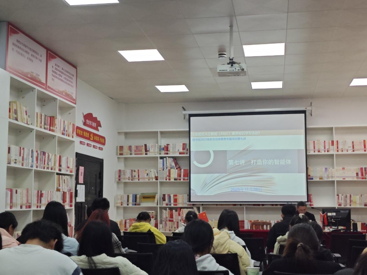 随着人工智能技术日益深入学习和工作场域,信息素养已成为大学生核心竞争力的关键组成部分。图书馆针对新生在信息获取、信息分析及人工智能工具使用过程中的实际需求,系统设计了培训课程体系,具体包括:(1)信息素养基础:从“图书馆空间资源服务”入手,介绍馆藏检索与电子资源使用方式;通过“信息素养与AI素养”讲座,阐释信息意识、知识、能力与伦理的基本内涵,并强调人工智能素养在智能时代的重要性;(2)职业规划赋能:“给未来职业画像”培训帮助学生认识职业分类、岗位要求及行业前景,通过职业信息检索与生涯规划制定,实现信息素养与职业发展的有效衔接;(3)专业资源利用:“知网资源利用”培训讲授文献检索、阅读与论文写作方法;“打造专业学习工具包”指导学生运用虚拟学习社区、考试考证资源库以提升学习效率;(4)AI素养及工具实操:“与AI高效沟通”分享提示词设计技巧;“用AIGC助力学习”演示如何借助人工智能辅助英语学习、论文撰写与学习计划制定;“打造智能体”课程则引导学生动手构建个性化AI助手,如新闻检索智能体与烹饪助手。