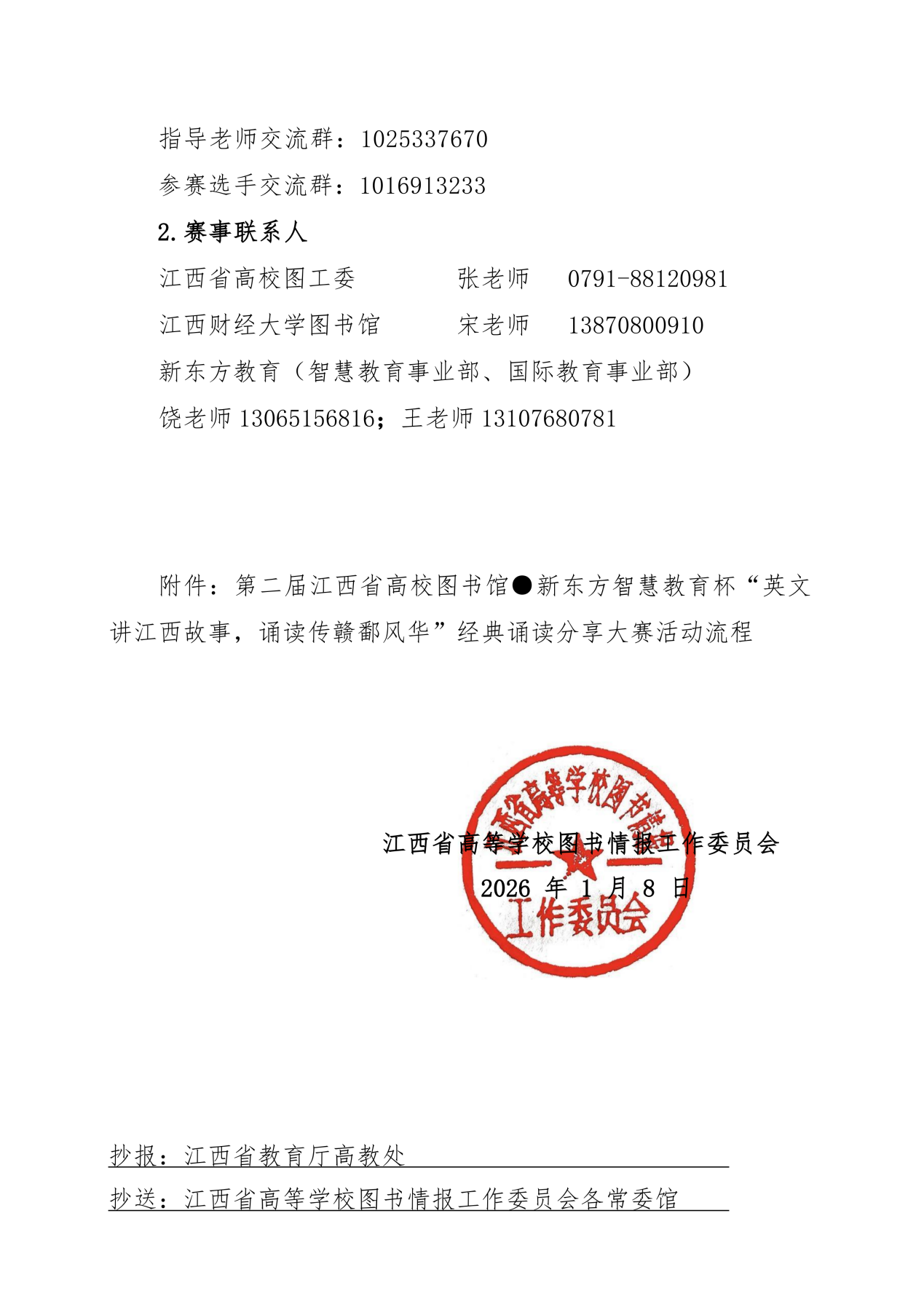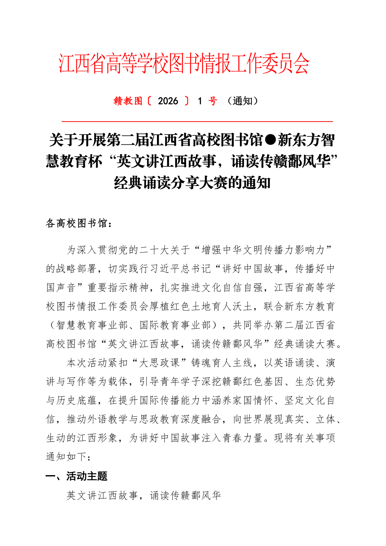 为深入贯彻党的二十大关于“增强中华文明传播力影响力”的战略部署,切实践行习近平总书记“讲好中国故事,传播好中国声音”重要指示精神,扎实推进文化自信自强,江西省高等学校图书情报工作委员会厚植红色土地育人沃土,联合新东方教育共同举办第二届江西省高校图书馆“英文讲江西故事,诵读传赣鄱风华”经典诵读大赛。
