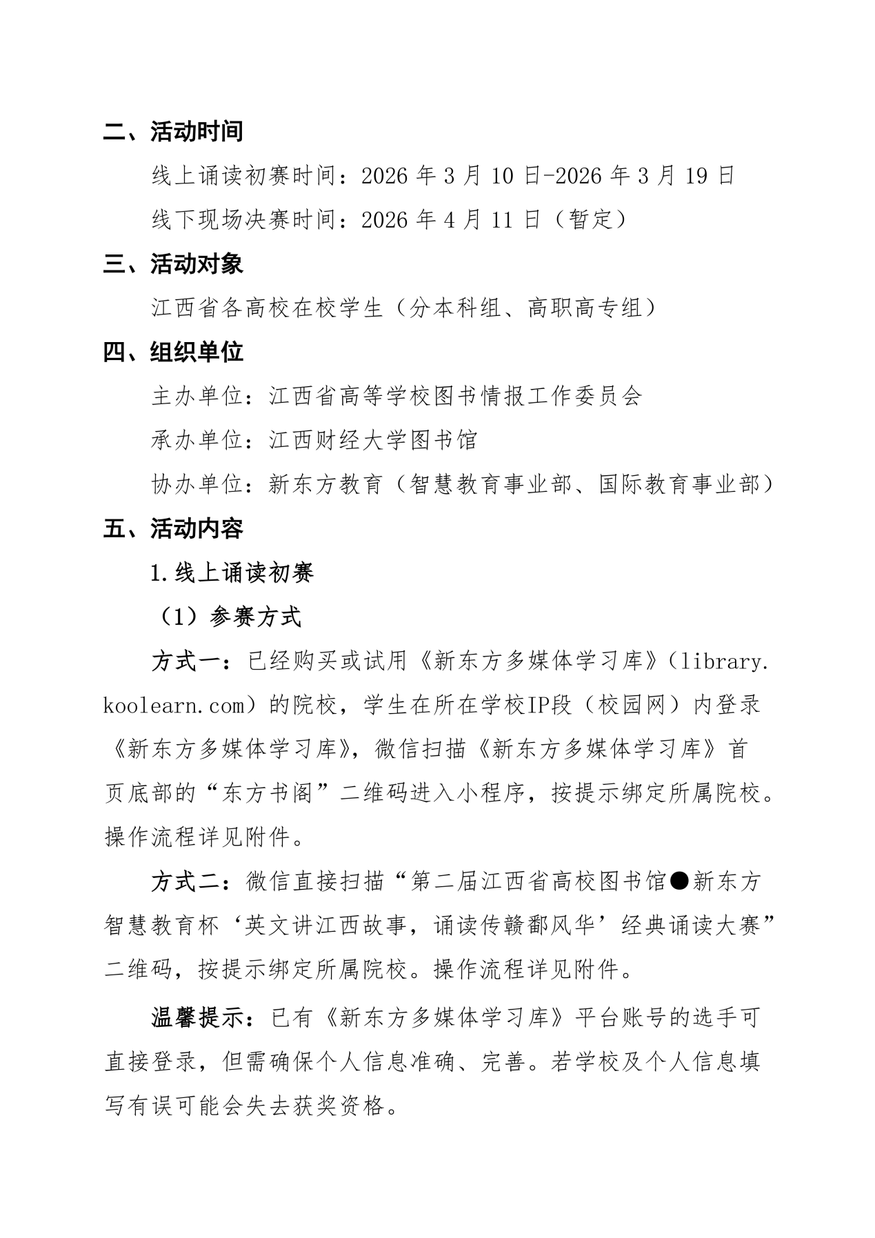 本次活动紧扣“大思政课”铸魂育人主线,以英语诵读、演讲与写作等为载体,引导青年学子深挖赣鄱红色基因、生态优势与历史底蕴,在提升国际传播能力中涵养家国情怀、坚定文化自信,推动外语教学与思政教育深度融合,向世界展现真实、立体、生动的江西形象,为讲好中国故事注入青春力量。本次经典诵读分享大赛包括线上诵读初赛和线下现场决赛两个环节,现将我校线上诵读初赛活动内容提示如下: