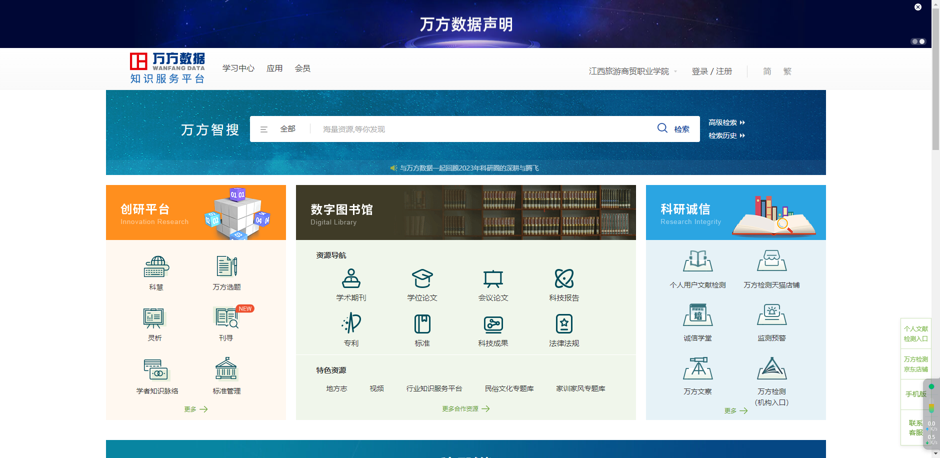 万方数据知识服务云平台(Wanfang Data Knowledge Service Platform)集品质知识资源、先进的发现技术、人性化设计于一身,是国内一流的品质知识资源出版、增值服务平台。目前平台出版的资源总量超过2亿条,全面覆盖各学科、各行业。基于海量高品质的知识资源,运用科学的方法和先进的信息技术,构建了多种增值服务,是国内最大、最齐全、最权威的中文数据库服务平台之一,是科研工作必不可少的辅助工具!