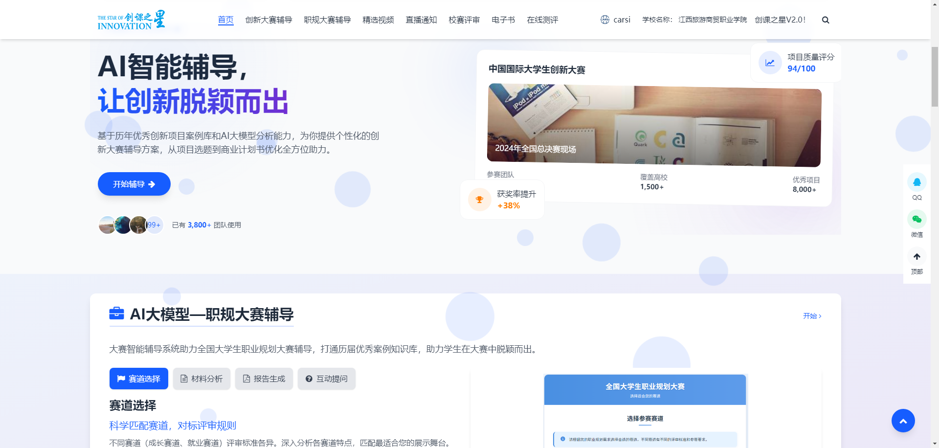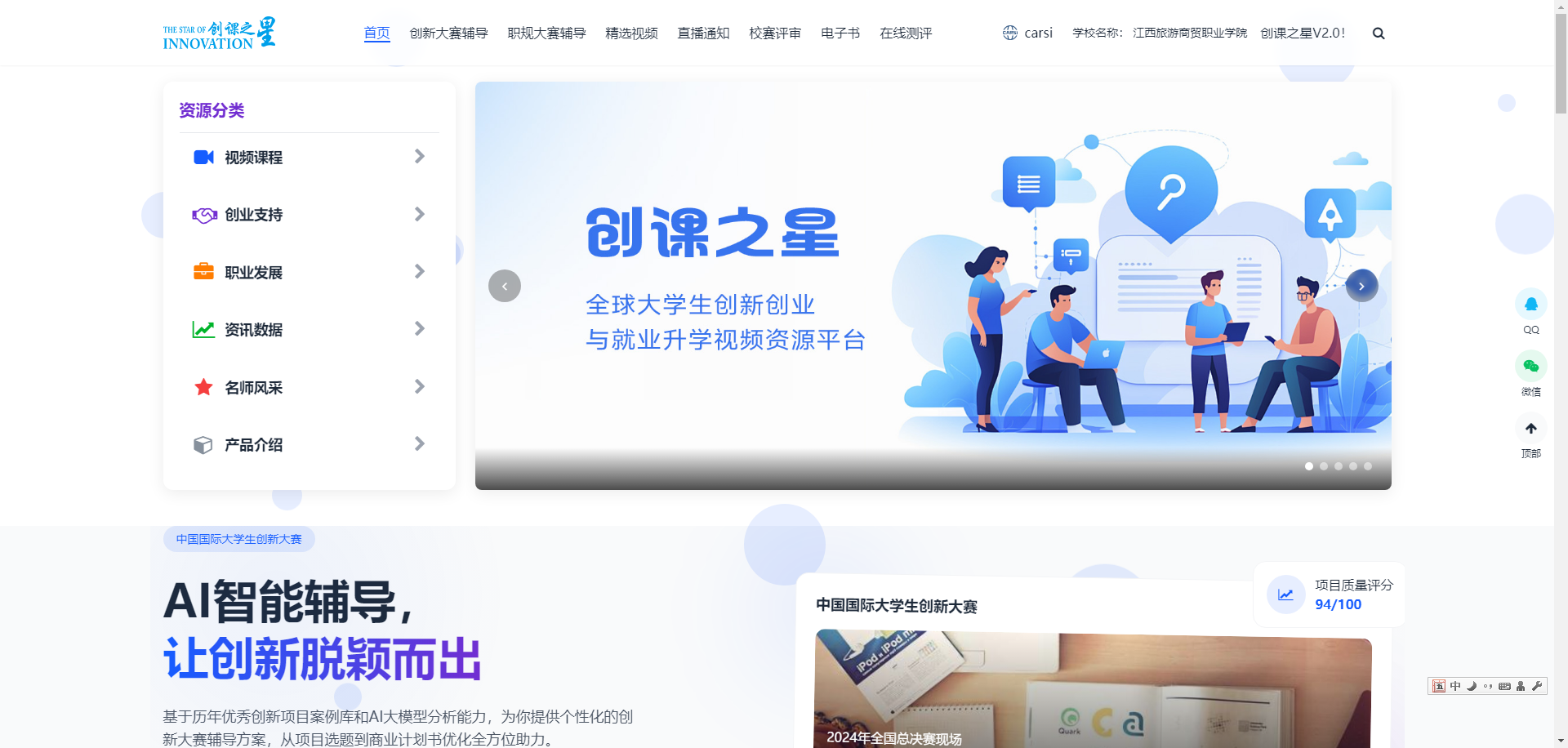 3. 创新大赛提供赛制解读与获奖项目路演视频,助力备赛;校赛评审系统与项目打磨智能体支持创新大赛全流程管理和项目打磨。