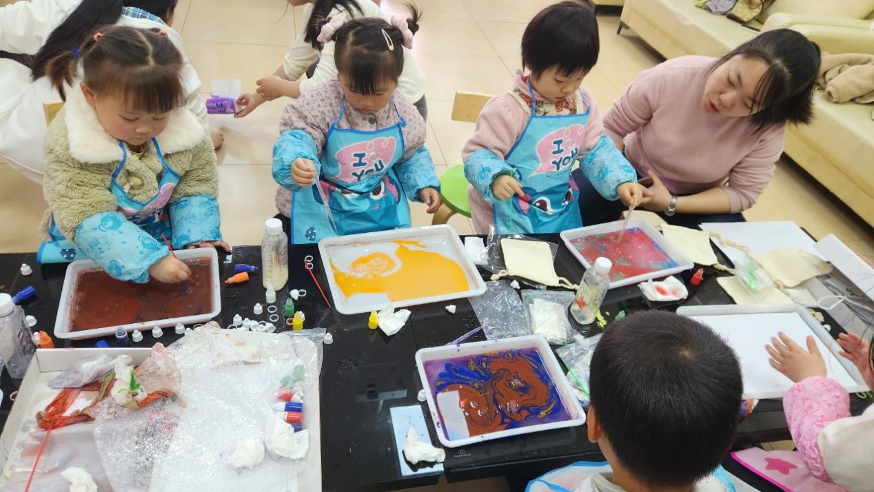 活动伊始,学前教育专业学生便以饱满的热情投入到活动中,热情展示水拓画成品图及衍生品样品,激发孩子们浓厚的兴趣。