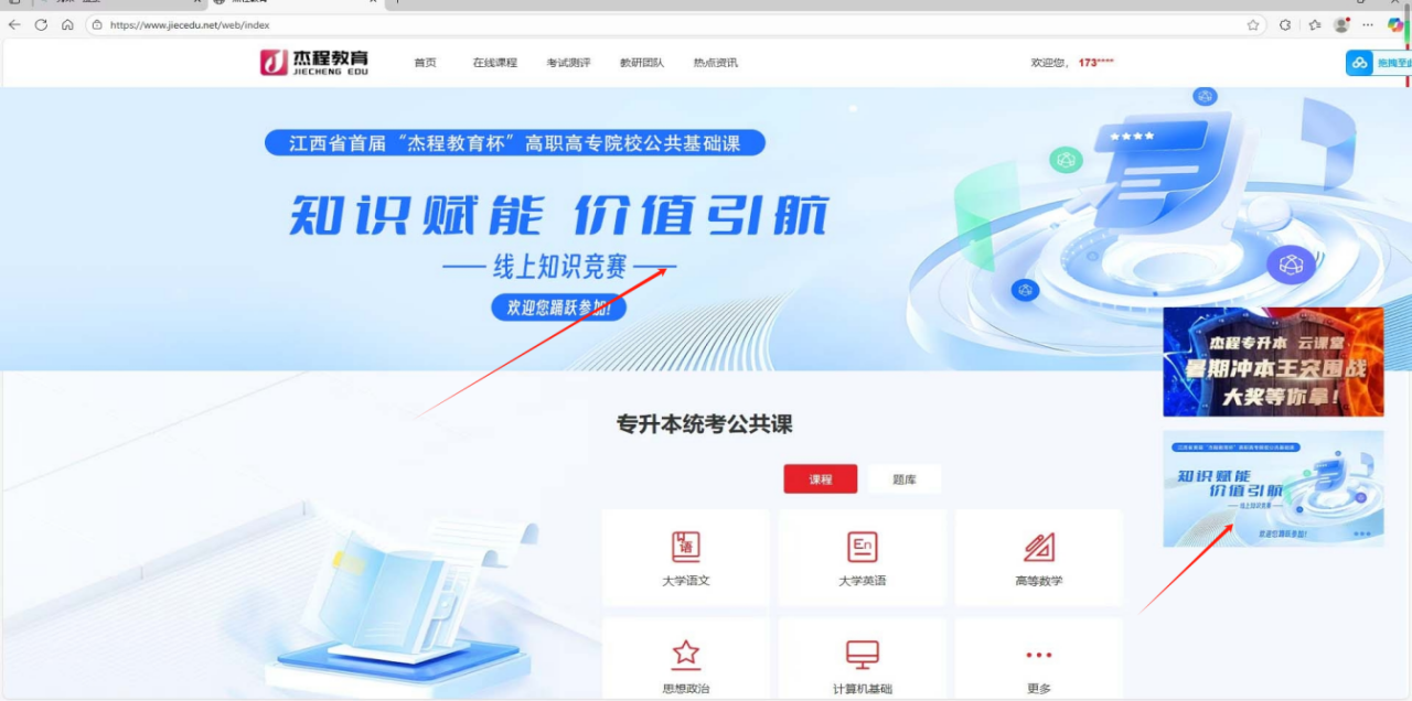 1.登录本校图书馆“数字资源”找到“杰程专升本云课堂”或直接用非微信浏览器登录(https://www.jiecedu.net/),找到活动宣传轮播图或者活动宣传浮标点击进入,选择相应的活动阶段。