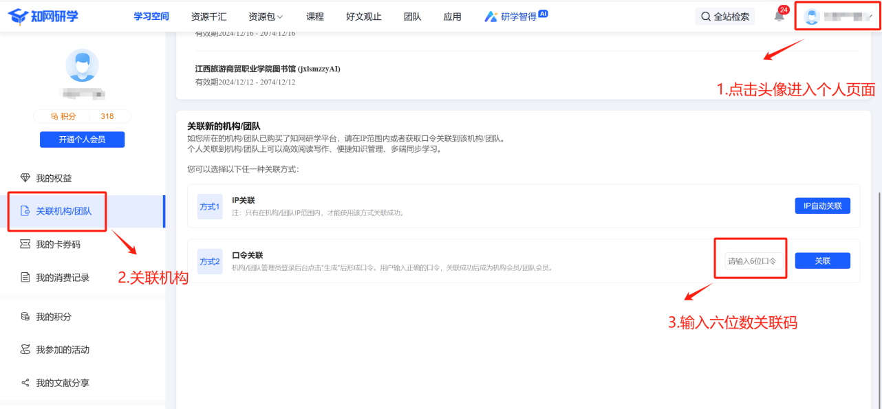 2.点击右上方头像,进入个人设置界面;点击左侧“关联机构/团队”;选择“口令关联”,输入本校六位数关联口令:FHL3BT(或者口令:R97J5W),两者只需要关联1个,关联“江西旅游商贸职业学院”机构账户,关联成功后即可通过手机随时随地使用知网研学。