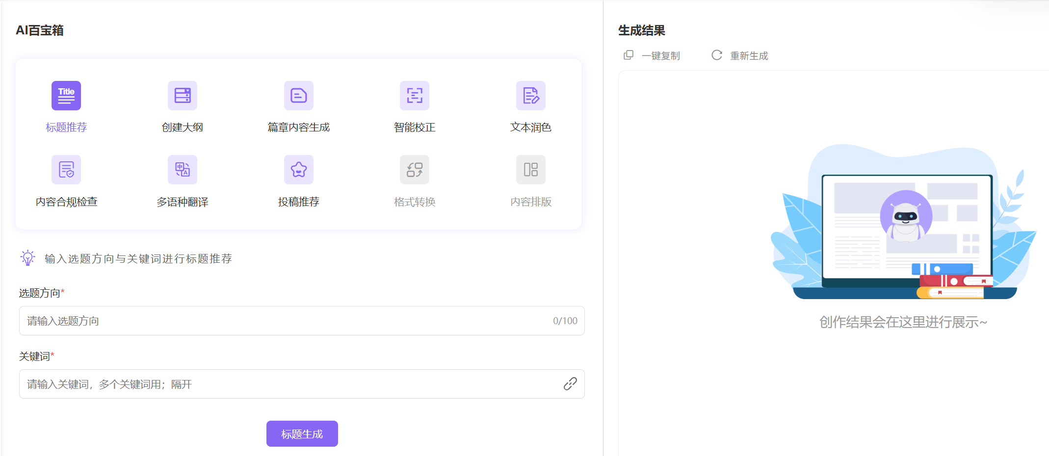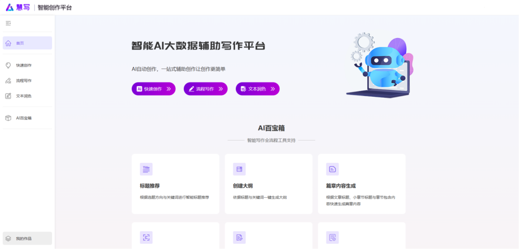 慧写智能创作平台的百宝箱页面,集成了一系列全方位的智能写作工具。从标题生成、大纲构建,到文本润色、校正,提供完整的写作解决方案。同时,该页面配备了参考文献自动生成、多语言翻译、格式转换以及智能排版等实用功能。针对用户输入的内容能够进行合规性检查,并提供期刊智能推荐服务,为用户的写作工作提供全面且专业的支持。