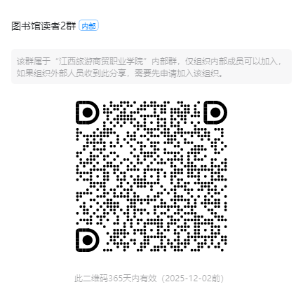 图书馆读者2群:https://qr.dingtalk.com/action/joingroup?code=v1,k1,MjO8pkBgohTdefjxFHTOR2XvzNMLi7wm1lWo/2QbwQs=&_dt_no_comment=1&origin=11