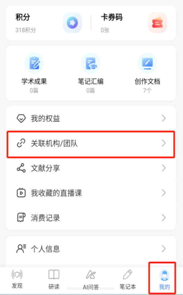 完成注册后,输入用户名和密码登录系统,点击“我的”→“关联机构/团队”→“口令关联”,输入本校六位数关联口令:B7AMDM,关联“江西旅游商贸职业学院”机构账户,关联成功后即可通过手机随时随地使用知网研学。