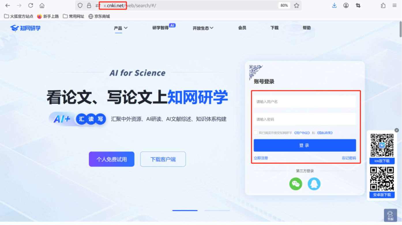 1.登录知网研学网址:x.cnki.net,完成注册后,输入用户名和密码登录系统。