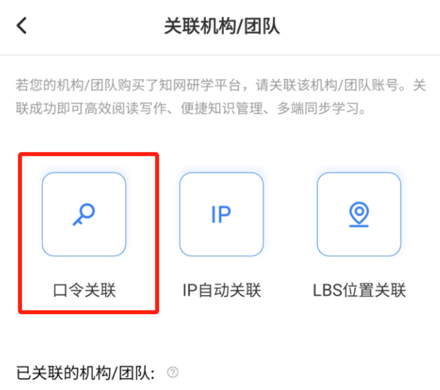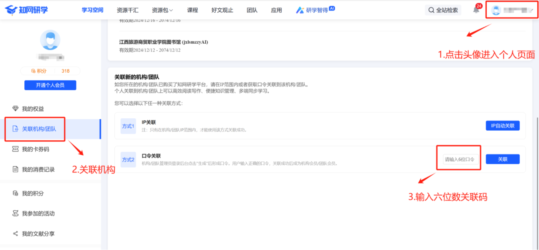 2.点击右上方头像,进入个人设置界面;点击左侧“关联机构/团队”;选择“口令关联”,输入本校六位数关联口令:B7AMDM,关联“江西旅游商贸职业学院”机构账户,关联成功后即可通过手机随时随地使用知网研学。